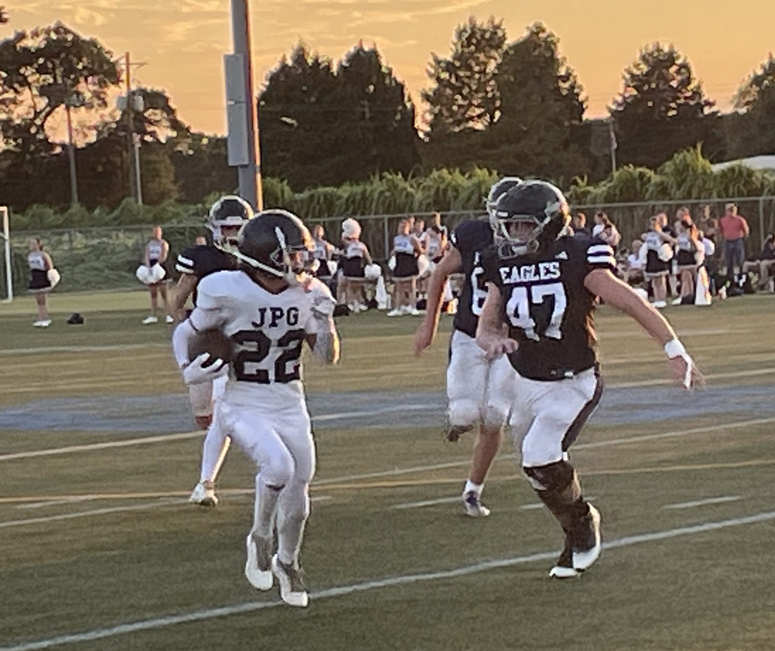 “John Paul the Great showed they are a team that’s been there,” Eagles head coach Grayson Standiford said after the game. “We’re still trying to figure it out.” The Eagles’ program, in its third year of tackle football, will certainly benefit in time if its junior varsity program brings players through its system to the varsity level as has JPG. For now, as Standiford points out, the disparity remains.